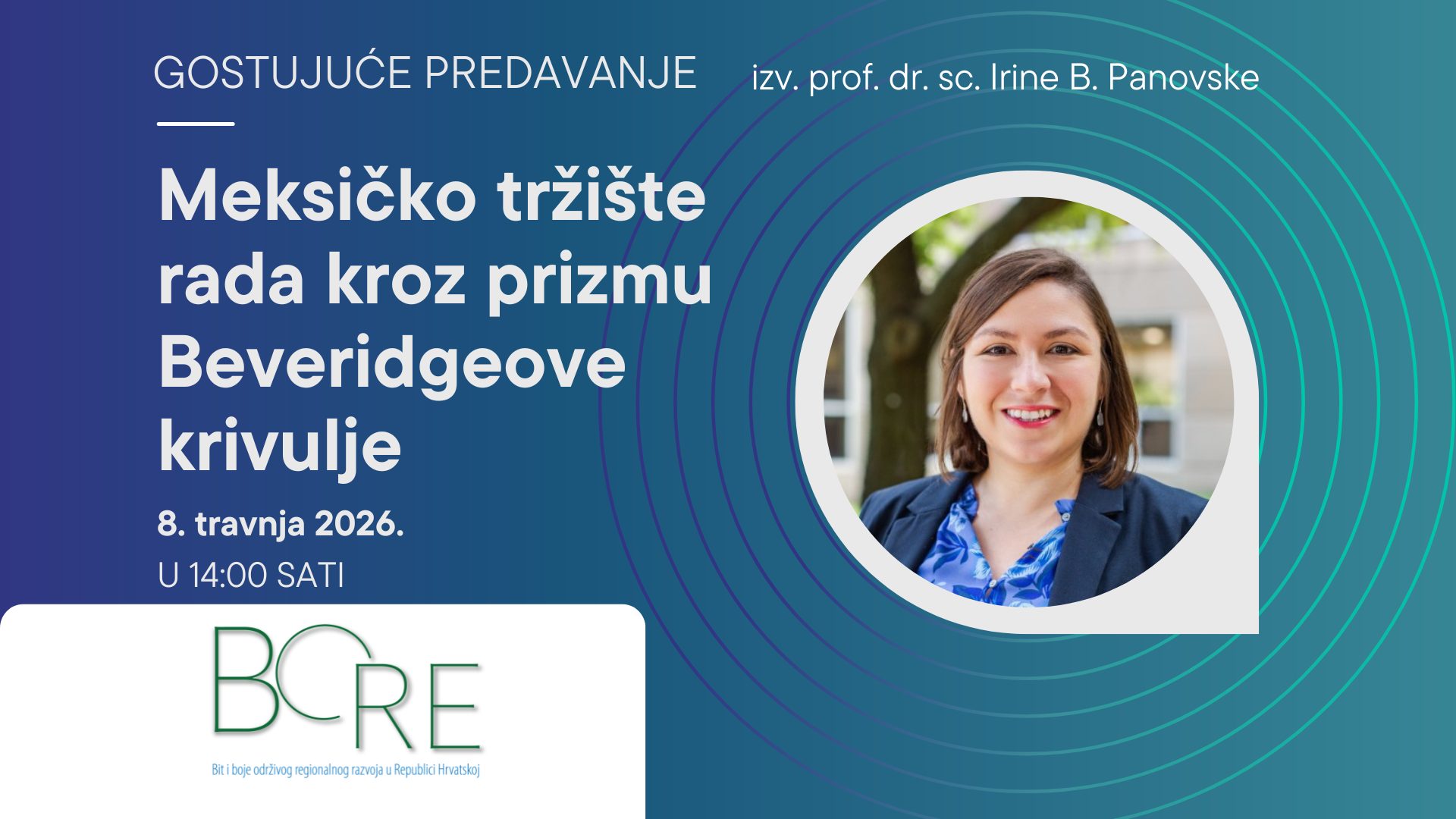 Pozivamo vas na gostujuće predavanje izv. prof. dr. sc. Irine B. Panovske s Škole za ekonomske i političke znanosti, Sveučilišta u Texasu u Dallasu, SAD-u, u srijedu, 8. travnja 2026. u 14:00 sati u knjižnici Instituta za razvoj i međunarodne odnose (IRMO). Predavanje se održava u sklopu projekta BORE – Bit i boje održivog regionalnog razvoja u Republici Hrvatskoj.